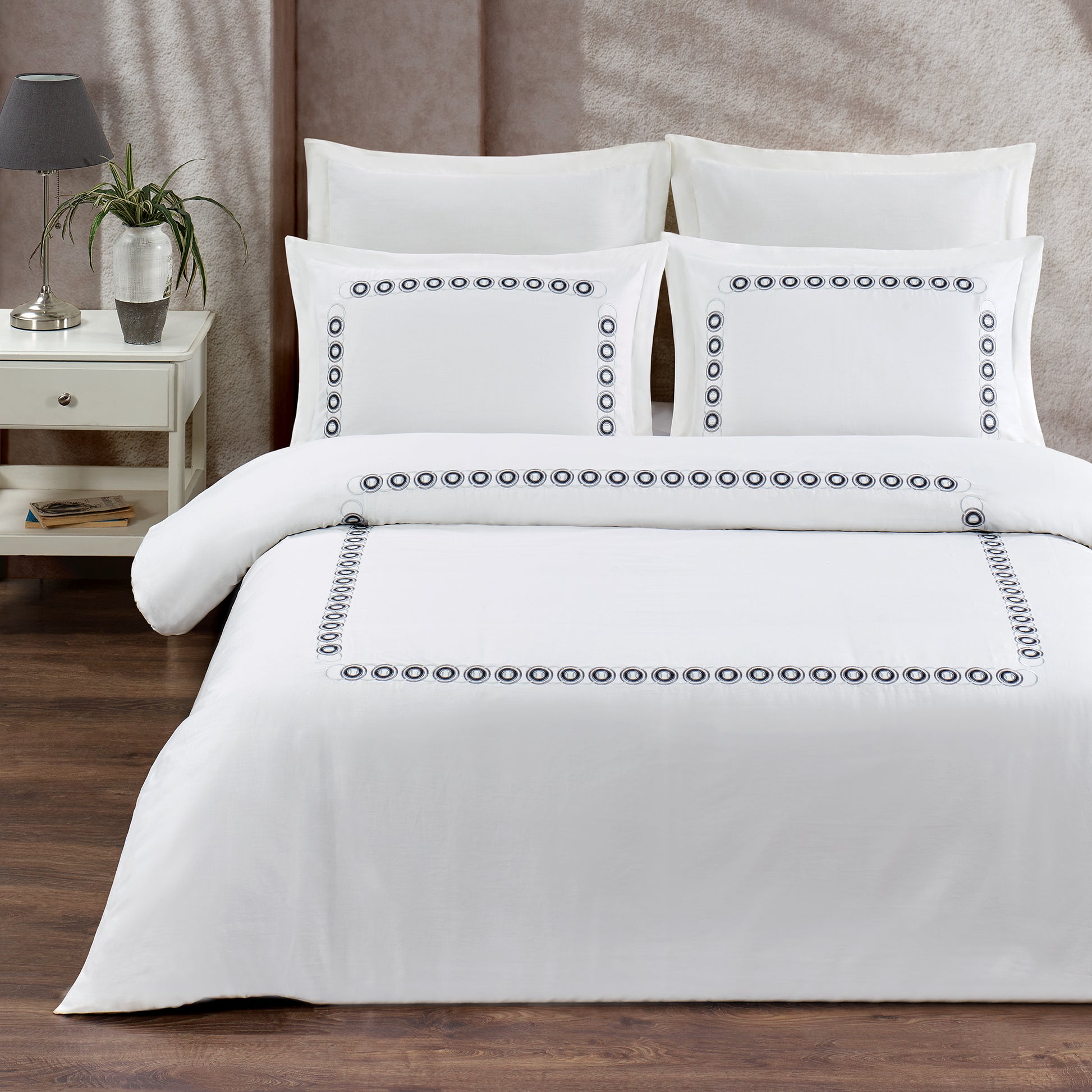 Zarafetin ve konforun birleştiği 210 TC %100 Nakışlı Pamuk Saten Nevresim Takımı, yatak odanıza sofistike bir dokunuş katıyor. Yüksek kaliteli pamuk ipliklerden üretilen saten kumaşı, yumuşacık dokusuyla teninize ipeksi bir his sunarken, özenle işlenmiş nakış detaylarıyla şıklığı bir adım öteye taşıyor.