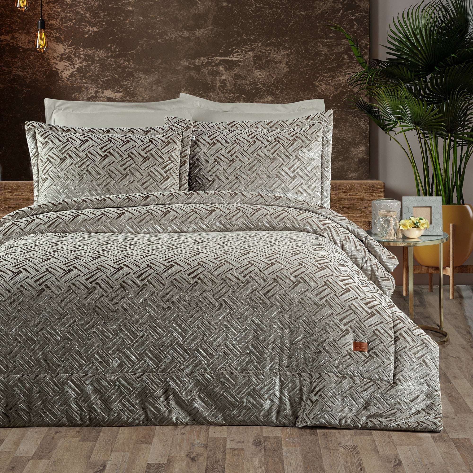 Salvatore Jakar Kadife Çift Kişilik Yatak Örtüsü Takımı Bej