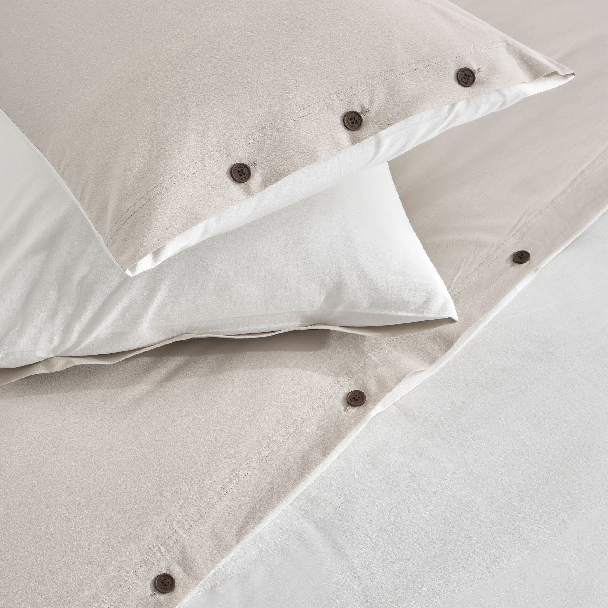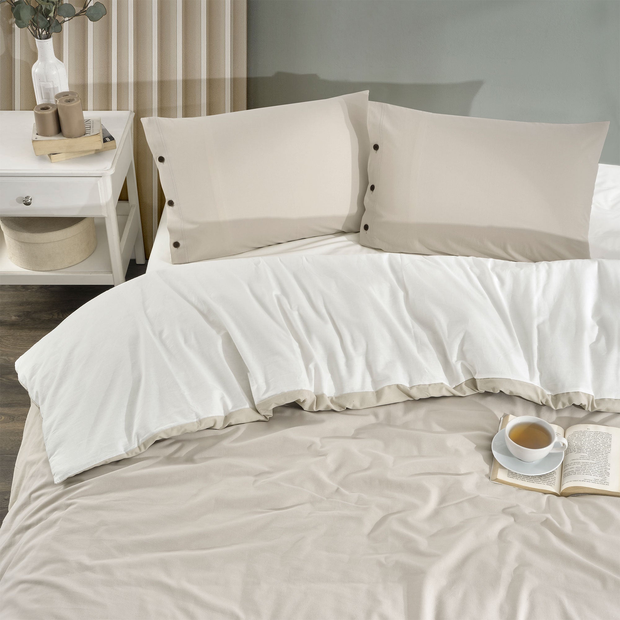 Renk: Nevresim ve yastık ön yüzü bej, arka yüzü beyaz, çarşaf beyaz